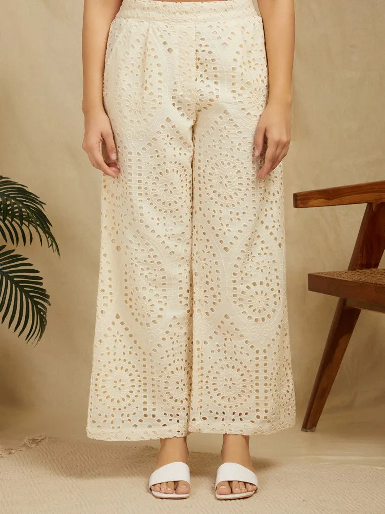A stunning Schiffli-embroidered longline shirt paired with trousers, combining elegance with comfort.