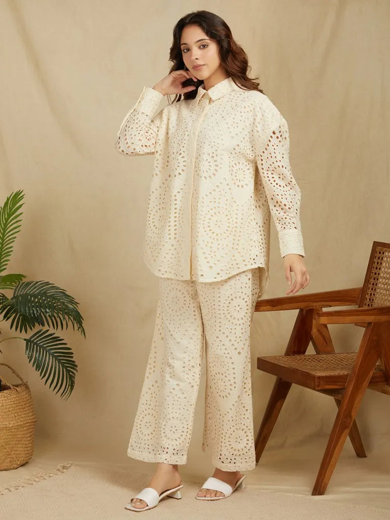 Through this painstakingly made beige co-ord set, embrace classic beauty. This two-piece outfit consists of pants and a top. The cotton shirt features long sleeves, a collar neckline, front button details, and all-over schiffli embroidery. A cotton voile lining is included. The cotton pants have an elasticated waist and schiffly embroidery all over them. A cotton voile lining is included.