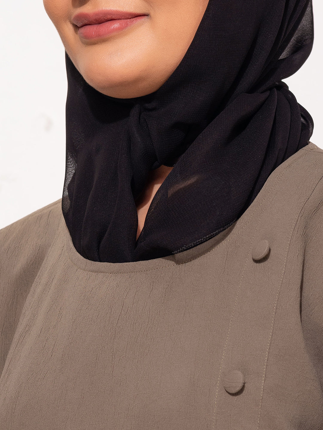 Step into effortless style with our Olive Green Two-Piece Set, a versatile outfit designed for the modern modest woman. Featuring a sleek long tunic with asymmetrical button details and matching wide-leg trousers, this set blends comfort, coverage, and sophistication.