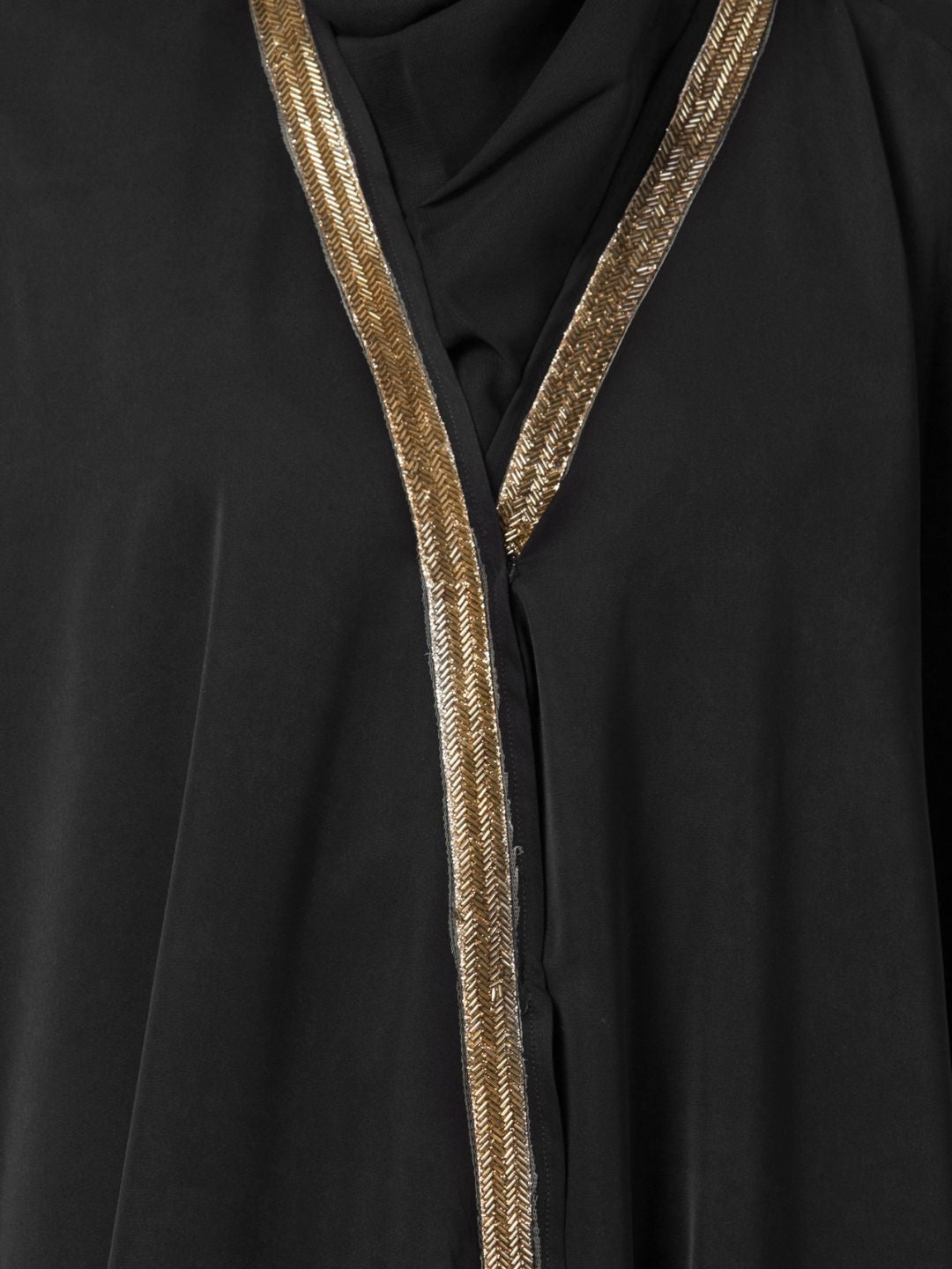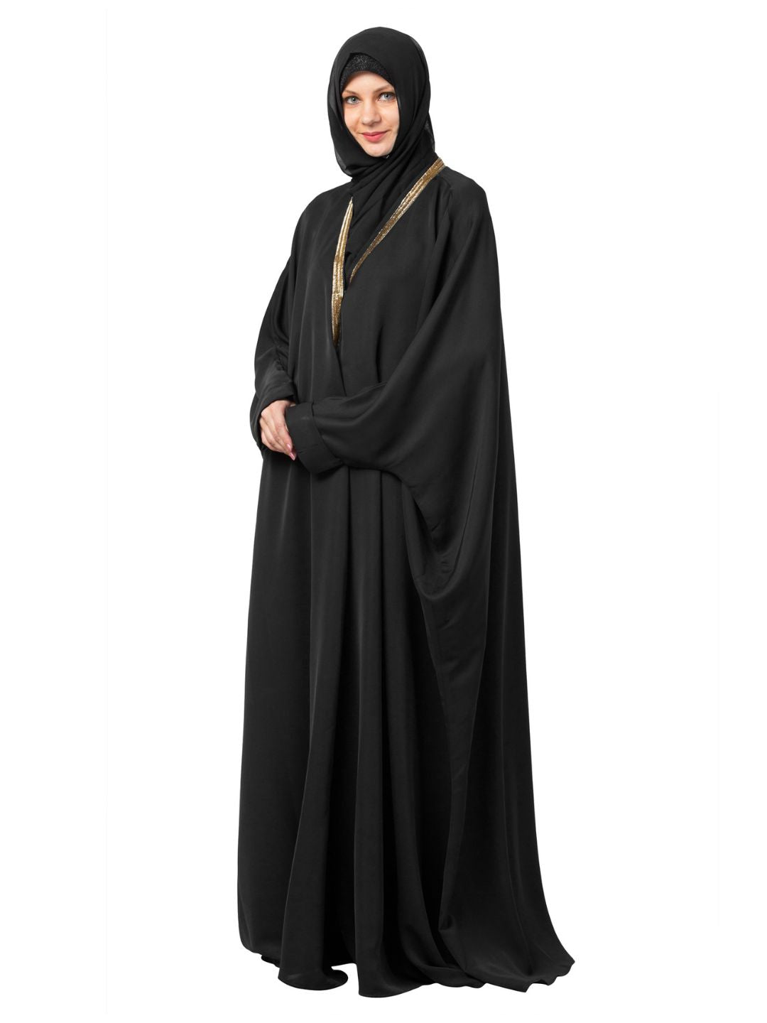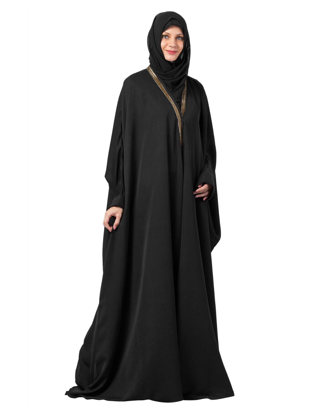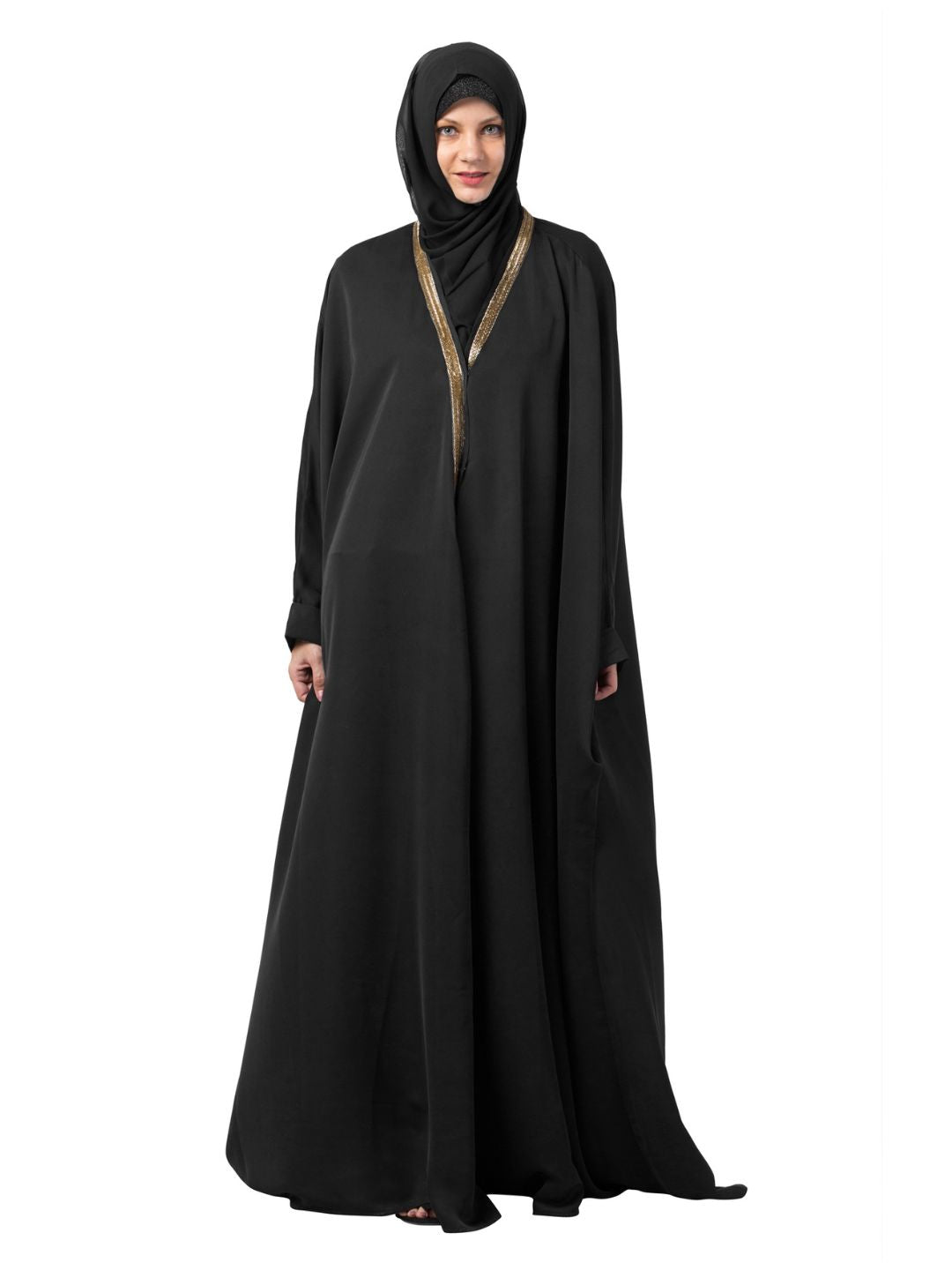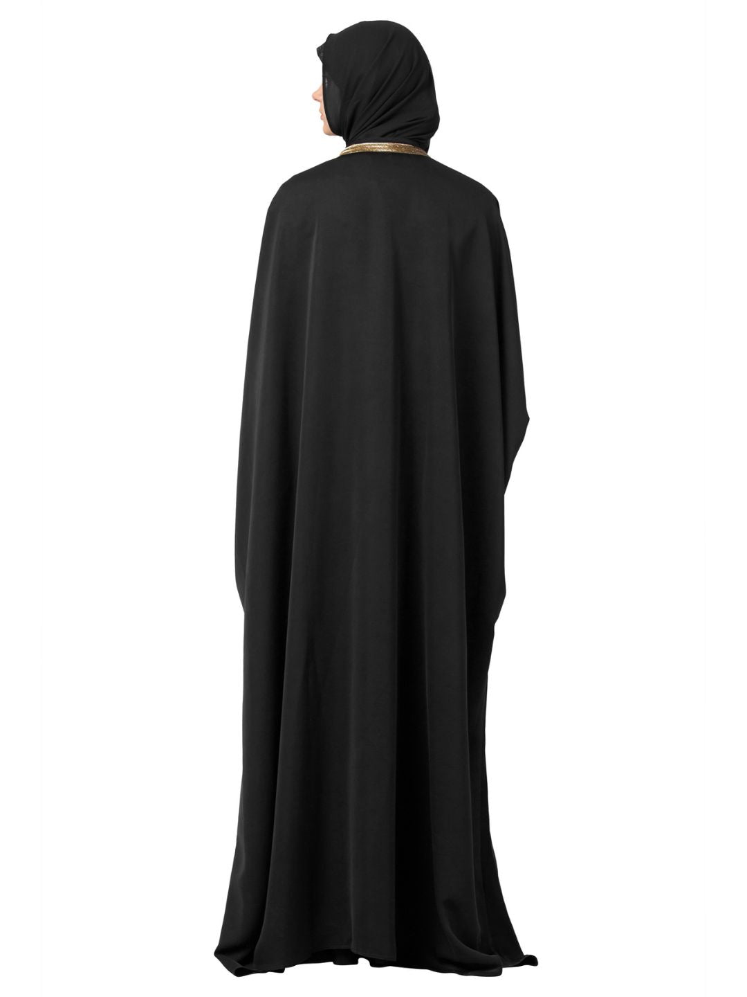 Radiate serenity with the Embellished Gold Lace Abaya Black. The radiance of this fabric and style symbolizes positivity and beauty, creating an elegant and modest garment. Immerse yourself in the graceful energy of this abaya during moments of prayer.