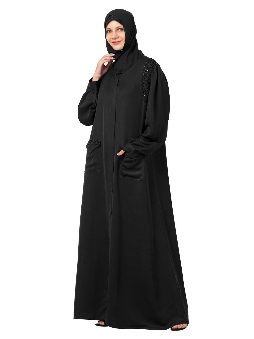 Radiate serenity with the Embellished Pocket Abaya Black. The radiance of this fabric and style symbolizes positivity and beauty, creating an elegant and modest garment. Immerse yourself in the graceful energy of this abaya during moments of prayer.