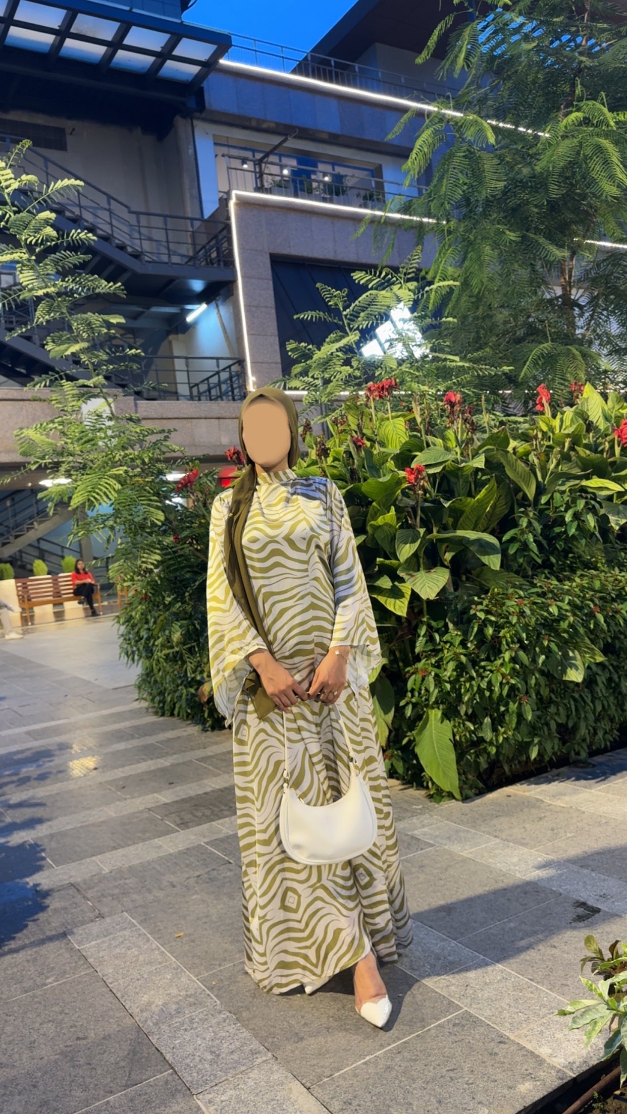 Complete the look with a coordinating olive green hijab and white pointed flats for a chic, put-together vibe.
